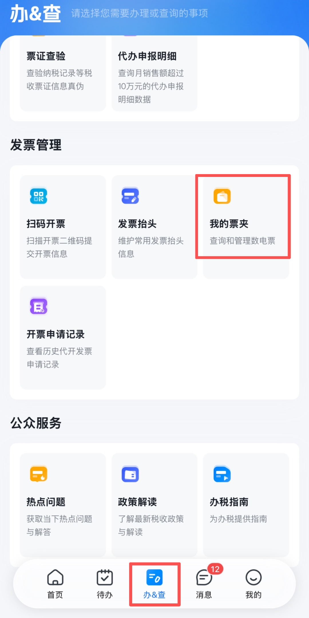 6.销售方完成发票开具后,在“办&查”频道,点击【发票管理】→【我的票夹】→【我销售的】可查看到已开具的代开发票。