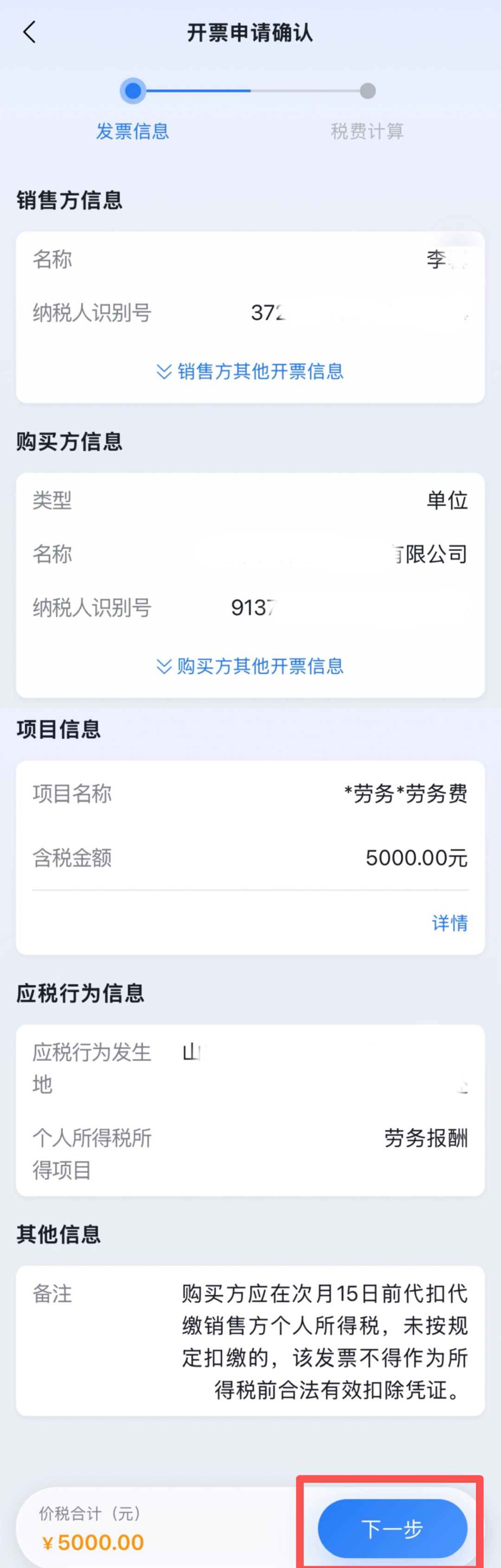 2.进入代开申请流程在“发票信息”页面,代开申请人确认企业预填的销售方信息、购买方信息、项目信息、应税行为信息、其他信息是否正确,不支持代开申请人修改,如有异常,可联系企业修改。 确认申请信息无误后,点击【下一步】进入税款计算页面,确认增值税、城市维护建设税、教育费附加、地方教育附加等各项征收项目应纳税额、减免税额、应缴税额等信息。