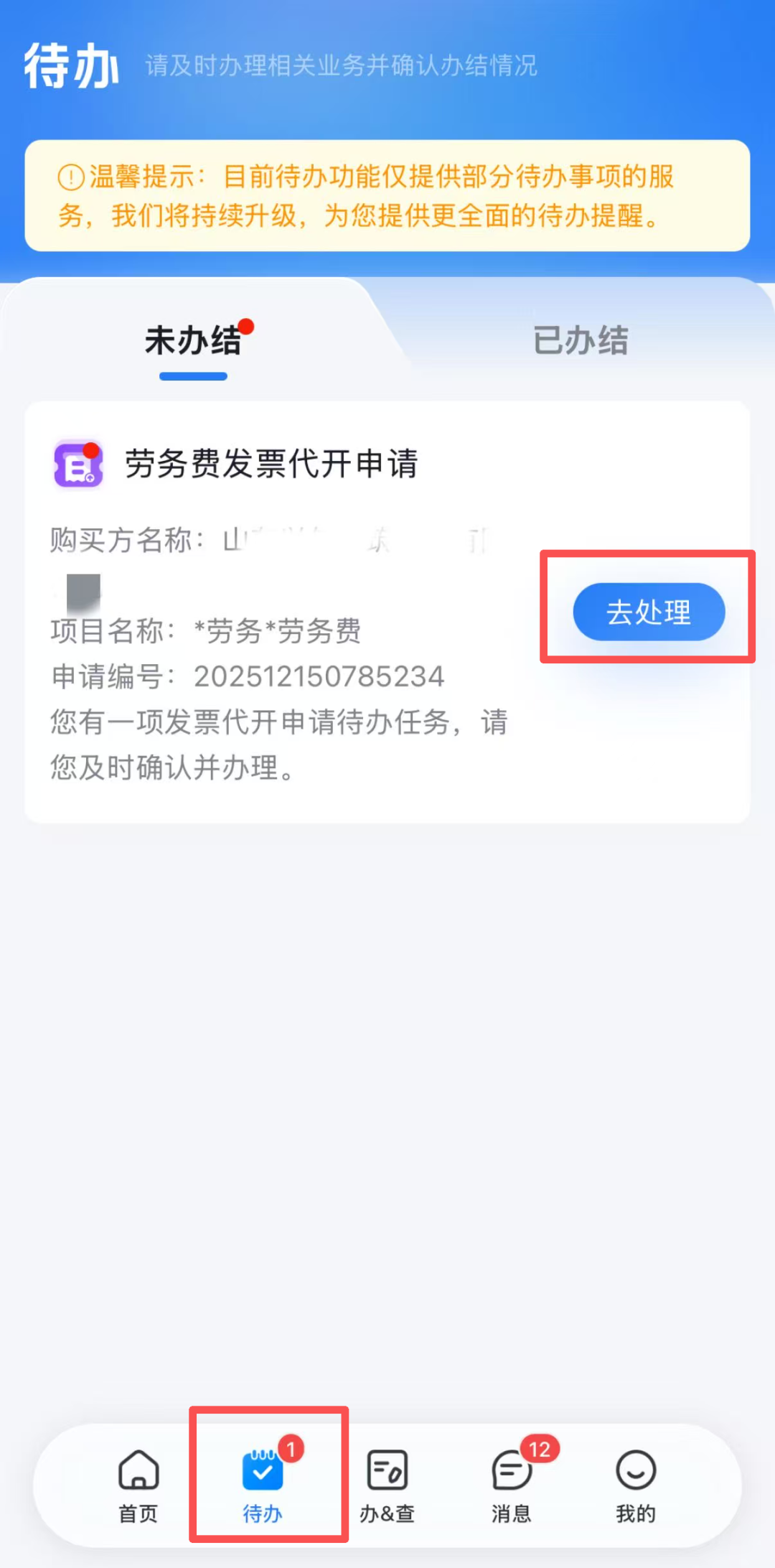 1.若企业已为代开申请人(销售方)发起劳务费发票代开申请信息,滨海新区麦克企业代开申请人登录个人所得税App,点击【待办】,可查看到“劳务费发票代开申请”待办,点击【去处理】,进入发票信息确认页面。
