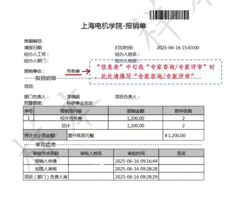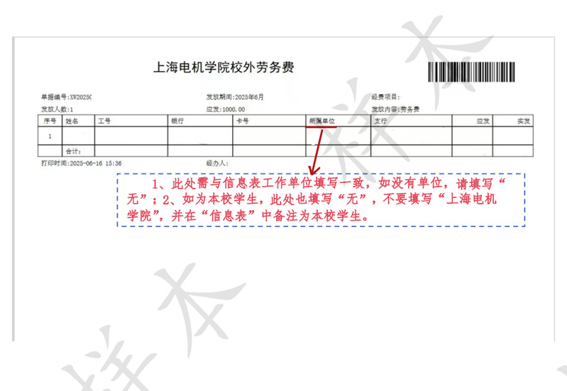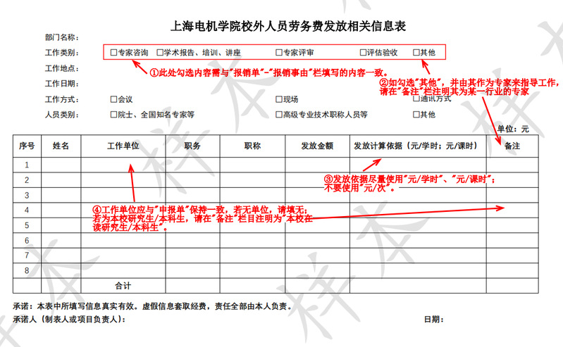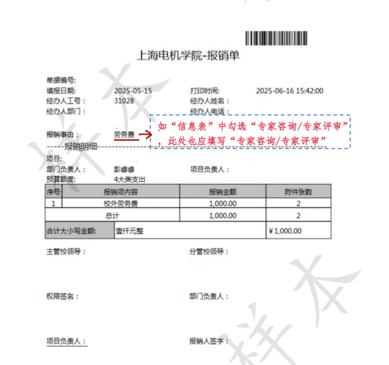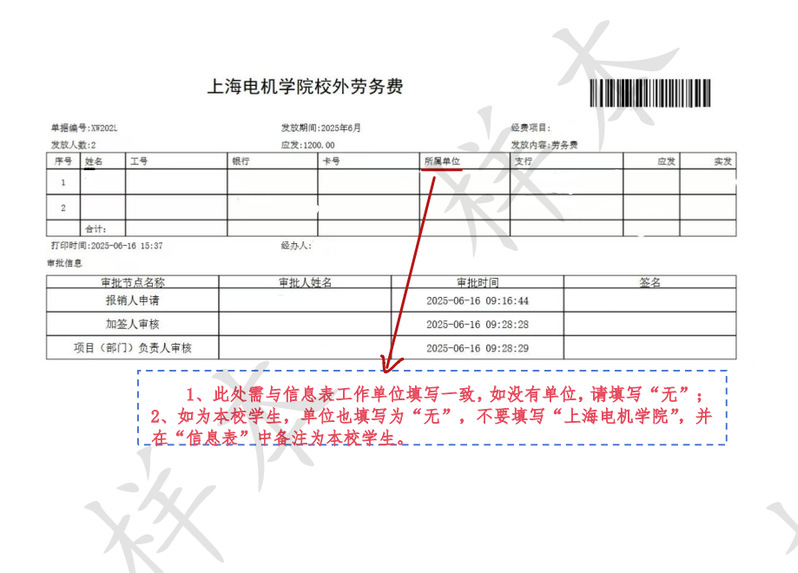 劳务费发放标准(横向) 劳务费发放标准(其他) 三、注意事项 1、信息表勾选工作类别为“专家咨询/专家评审”,报销单报销事由需填写一致。 2、信息表人员类别勾选为“其他”的,若由其作为专家来进行指导,建议备注其在某一行业为专家。 3、信息表发放计算依据需要填写发放金额的计算过程,例如:800元/天*3天=2400元 或300元/学时*3学时=900元。文件上发放标准为**元/学时的请尽量按学时数填写,不要按天/次填写。 4、申报单所属单位需与信息表工作单位填写一致,如没有单位,都填写无;如为本校学生,单位也填写为无,不要填写为“上海电机学院”。 5、信息表需规范填写,各栏目不能有空白,没有请填写无。 6、备案表项目编号需与实际报销项目一致,备案日期需在工作日期前。 7、自2025年5月1日起,薪资平台每月申报截止日为每月20日。 四、办理流程 上海电机学院官网→智慧校园融合门户→应用中心→财务系统→薪资申报→选择“校外劳务”/“校内劳务”-“创建”单据-填写好申报信息→选择“是否走线上审批签字流程” ① 线上审批→附件栏上传上述材料3(必须上传)、材料4(视条件上传)→线上审批签字(提前完成个人电子签章认证:企业微信APP-电子签章系统)→财务审核完成 ② 线下审批→填写打印纸质件→签字→投递至临港校区行政楼财务大厅/闵行校区办公楼财务处→财务审核完成 (责任编辑:) |