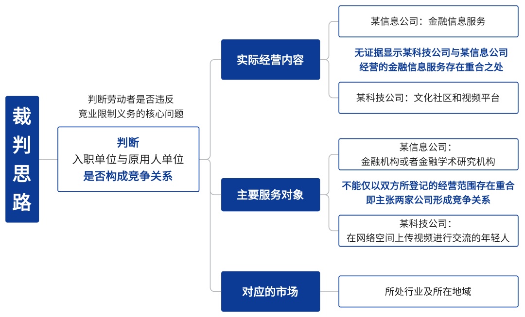 ▴ 点击查看大图 ▴ 04 案例评析 一、竞业限制的范围:合理性审查之必要性 (一)竞业限制制度的立法本意 竞业限制制度的立法目的在于防范离职员工利用在原用人单位处所掌握的商业秘密或有运用的潜在可能而不正当地抢占原用人单位的市场份额,侵害原用人单位的竞争优势。 其本质是由法律予以规范并由当事人协商适用的一种利益协调机制,其侧重点在于保护用人单位相关商业秘密所蕴含的竞争利益,通过有限地限制劳动者择业自由以降低利用用人单位商业秘密进行不正当竞争的可能性,并对劳动者因此所遭受的损失提供经济补偿,从而实现劳动者与用人单位之间的利益平衡。 可以说,劳动法领域的竞业限制制度与商业秘密保护法、反不正当竞争法共同构建了从内至外的企业竞争优势保护体系。 (二)竞业限制范围的合理限度 竞业限制被滥用,微观上不利于保护劳动者劳动就业权,宏观上也不利于市场人才流动,阻碍人力资源的优化配置。因此,对竞业限制范围的合理性审查具有保护企业商业秘密与竞争优势的同时兼顾劳动者基本生存权和择业自由的现实意义。 竞业限制范围的合理限度,一是体现在竞业期限的限制。应严格遵循法律规定,不得超过两年。二是竞业限制主体需限于必要范围。限于用人单位的高级管理人员、高级技术人员和其他负有保密义务的人员。三是对劳动者就业限制需仅及于原用人单位的竞争企业,即与原单位生产或经营同类产品、从事同类业务。该限制仅应限于企业的核心竞争领域,而不能扩大到劳动者熟悉的整个专业领域,否则将无异于剥夺劳动者的生计。 二、竞争关系的认定:揭开登记经营范围之“面纱” 相较于竞业限制主体、竞业限制期限等,就竞争关系的认定,劳动合同法第二十四条所确定的“同类产品/业务”的标准如何界定,司法适用中存在较大的弹性空间。 (一)两种司法审查标准的分野 目前,对于劳动者前后入职的两家用人单位之间是否属于经营“同类业务”,司法实践中通常存在两种标准: 一是宽松审查标准,又称形式审查标准,即若两家企业营业执照登记的经营范围存在重合即认定二者存在同业竞争关系。 二是严格审查标准,亦即实质审查标准,即对两家企业间是否构成同业经营的审查不拘泥于营业执照,而要揭开登记经营范围的“面纱”分析用人单位实际经营业务。 (二)形式化审查标准的检视 形式审查标准与实质审查标准相较而言,前者易造成“竞争关系”范围的扩张,在不必要的范围内限制了劳动者择业自由,而后者则是将竞业限制范围限定在最小比例合理限度,有利于实现双方利益的实质性平衡。 1. 企业登记经营范围的规范意义已逐步减弱 从1999年以前依据《中华人民共和国民法通则》《中华人民共和国企业法人登记管理条例》等相关规定,至1999年的《合同法》及相应司法解释,再到2005年修订的《公司法》,对企业经营范围逐步“松绑”。 《民法典》亦不再将经营范围纳入规范范围。在性质上,登记经营范围的规范意义逐步弱化,其已不属于法定资格,而是处理企业内部关系的准则,主要在于限制法人机关的权利,明确法人机关的内部责任,实现出资者对自己投资的有效控制。随着登记经营范围完成功能更新,仅以此为据认定用人单位经营业务的审理思路也应随之适时转变。 2. 登记经营范围与实际经营范围不存在必然对应关系 根据2015年国家工商行政管理总局公布的《企业经营范围登记管理规定》,企业可参照《国民经济行业分类》中的大类、中类或小类自主选择经营范围表述用语,企业对经营范围的表达享有更多的灵活性和自主性。而随着智能化登记系统的普遍应用,企业登记经营范围从“填空题”变为“选择题”,登记注册更为便利。据此,企业概括性地以大类或中类宽泛界定自身经营范围成为常态。 另外,为了减少此后再行变更登记的成本,企业往往亦将将来可能开展的经营业务或与自身经营业务相关联的业务均一并予以登记,故实践中登记经营事项和实际经营事项不相一致的情形屡见不鲜。在此条件下,营业执照所登记的经营范围难以客观地反映企业真实的经营状态。 三、实质审查的归位:举证责任与认定标准 对两家企业的经营业务进行实质审查,可从所经营内容、服务对象或者所生产产品受众、对应的市场是否重合等多角度进行审查。 (一)举证责任的分配 从举证责任分配的角度而言,根据谁主张谁举证原则,主张劳动者违反竞业限制义务的用人单位应对此进行举证。 实践中,用人单位往往会提供企业工商登记材料,以二者经营范围存在高度重合为由予以证明,但这仅是完成了初步举证义务。此时,劳动者若能举证证明两家企业实际经营内容、对应市场、产品受众等并不相同,使得法官形成一定内心确信的,则举证责任又回归到用人单位。 此时用人单位需要就二者实际经营内容或生产经营产品相同或类似、对应市场、产品受众相同等进一步进行举证,若举证不能,则应承担相应不利后果。 如此,双方在“一来一回,一证一反”之间进行博弈,法院最终根据双方举证质证情况对两家企业是否构成实质性竞争关系进行综合评定,从而判定劳动者是否违反竞业限制义务。 需注意的是,用人单位的行业知名度或可影响对双方举证责任强弱的分配,若业内普通从业者甚至一般群众显而易见就